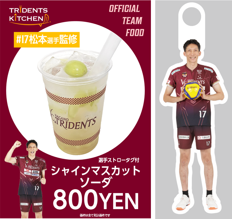 松本選手の大好物「シャインマスカット」を刻み、さっぱり・すっきりとした炭酸飲料に仕立てました!今が旬の信州のシャインマスカットを感じられるドリンクです!