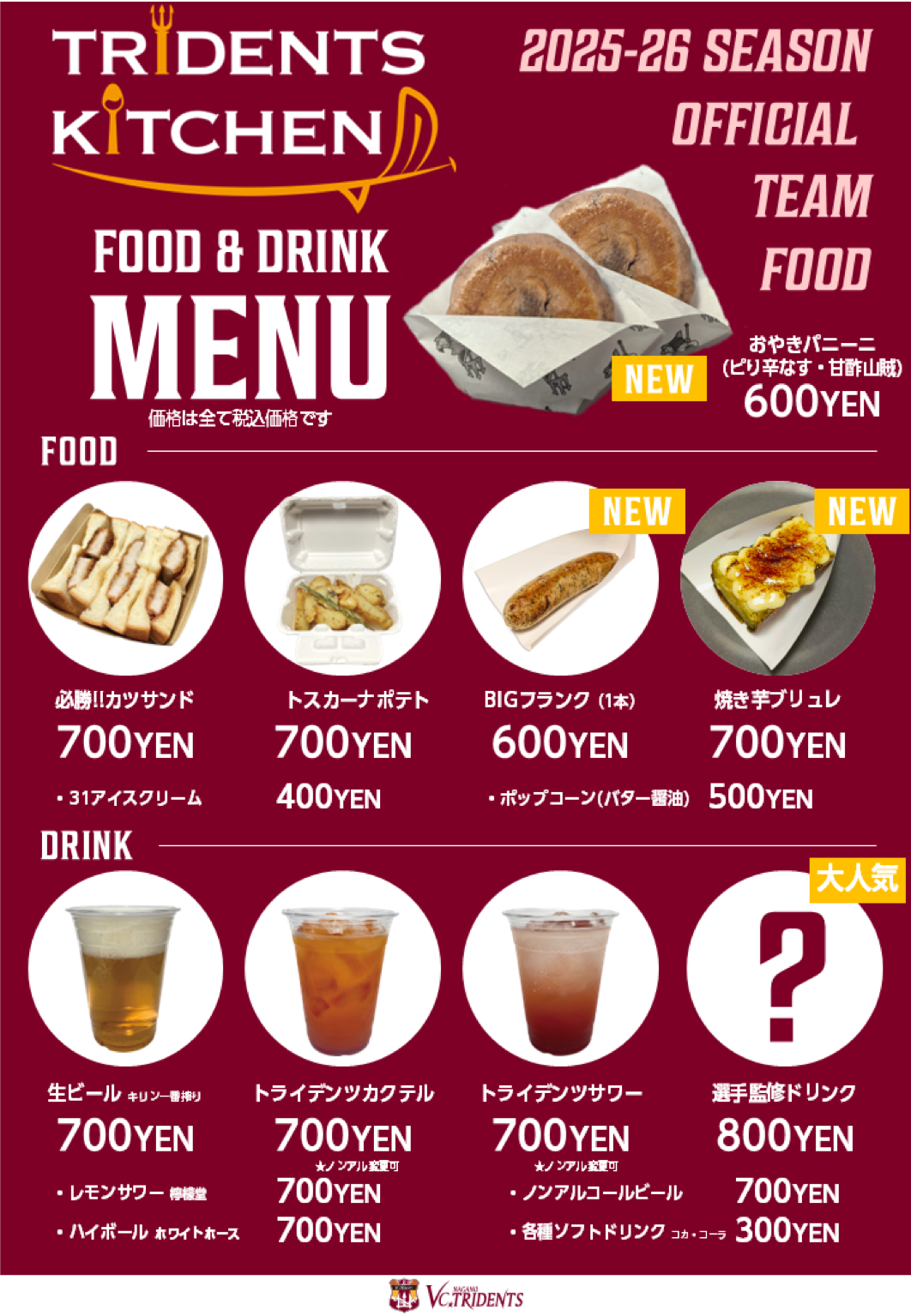 (選手監修オリジナルドリンク/おやきパニーニ/BIGフランク/必勝カツサンド/トスカーナポテト/など)